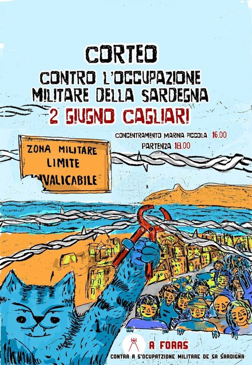 Per tutte queste ragioni sopra elencate ci vedremo il due giugno alle 16 a Marina piccola. Alle 17 inizieremo gli interventi, alle 18 partiremo in corteo per le vie della città più attenzionate dal turismo ma anche dalle caserme militari e da tutto ciò che ci colpisce. Faremo viale poetto e gireremo in piazza San Bartolomeo. Il percorso sarà di poco meno di due km. Passeremo in mezzo alle caserme per dimostrare che anche Cagliari, fra demanio e servitù militari, non è messa meglio del resto della Sardegna, anzi. Vogliamo costruire una manifestazione pacifica e gioiosa, con la partecipazione di tutta la popolazione, che possa aiutarci ad elaborare collettivamente tutta la rabbia e la frustrazione accumulata in questi mesi.