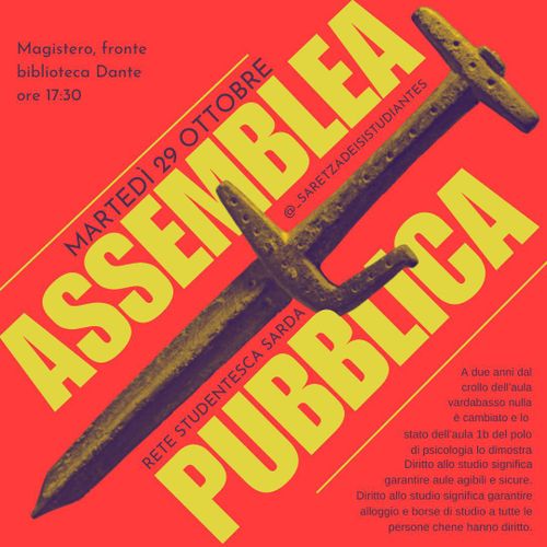 Assemblea Pubblica Rete Studentesca Sarda Tuesday, Oct 29, 2024, 05:00 PM magistero, piazzale fronte biblioteca Dante via is mirrionis, 1 Assemblea PubblicaCagliariDiritto allo studioRete Studentesca SardaRetza de is IstudiantesUniversità